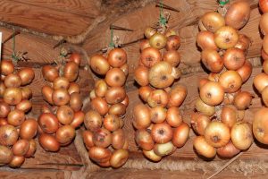 - сплетенные косы-вязанки, подвешенные на кухне, всю зиму будут радовать хозяев. В этом случае ботву не обрезают. В таком виде лук хорошо хранится при комнатной температуре, он не прорастает и не поражается шейковой гнилью. Нужно только следить за тем, чтобы не было повышенной влажности в помещении;