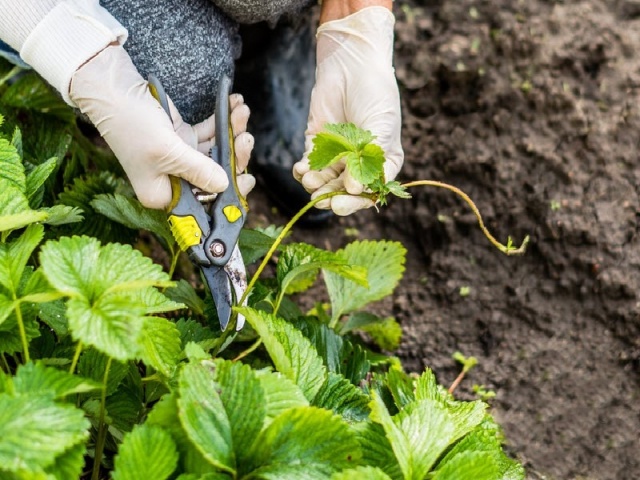 Если кусты уже дают ягоды, то рано весной обрезают с кустов все старые, сухие листики. Летом с кустов срезают все усы, оставляют только усы на маточных кустах, если хотят размножить клубнику. Осенью также у клубники обрезают усы.