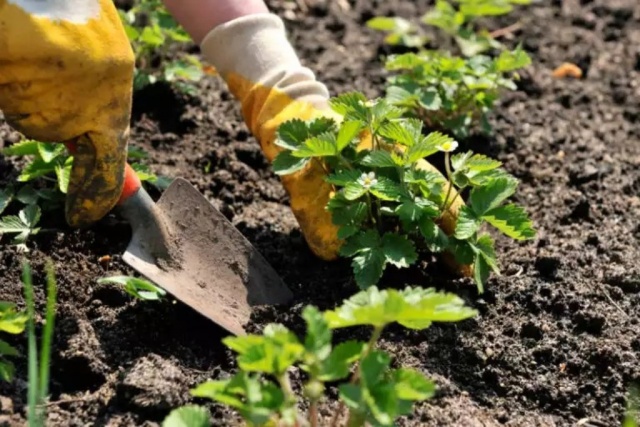 Перед посадкой саженцев клубники весной вилами повторно прокапывают землю, разравнивают ее и слегка утрамбовывают. Затем поливают водой и обрабатывают медным купоросом. Если же вы планируете посадить саженцы в сентябре, то подготавливайте землю за 3 недели до срока посадки.