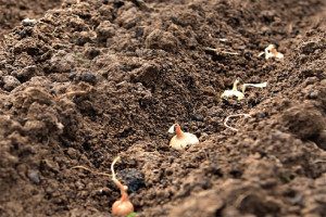 Высаживая севок, грунт уплотняют вокруг луковиц ладонью или доской, чтобы при отрастании корневая система не вытолкнула луковицу к поверхности почвы. Поверхностный слой почвы над луковицами должен быть не толще 2 см. Поскольку при заглублении луковиц происходит задержка их роста и снижение урожайности.